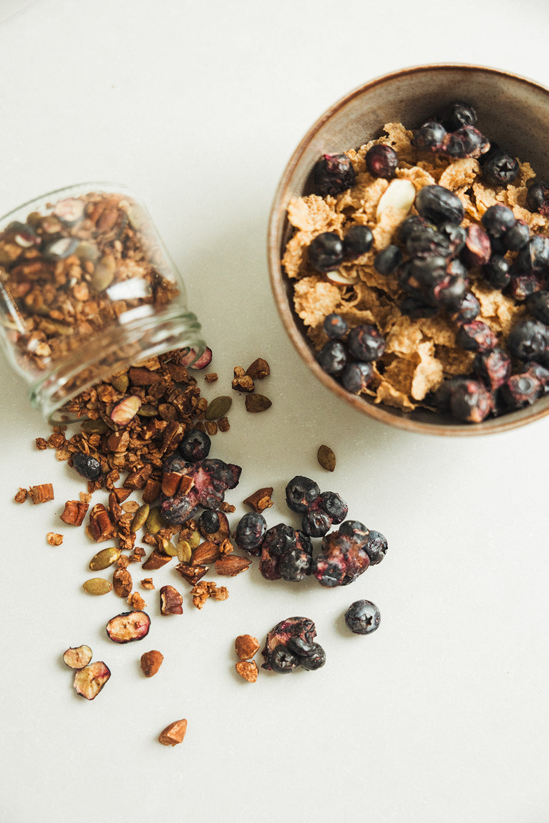 Flocons d’avoine, amandes, graines de citrouille, pacanes, bleuets lyophilisés, huile de coco, compote de pomme, sirop d’érable.